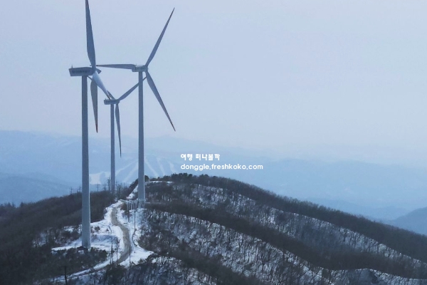 겨울철에는 눈이 내려 설경을 이루며, 맑은 날에는 푸른 하늘과 어우러져 더욱 선명한 경치를 감상할 수 있습니다. 태기산 정상에는 커다란 바람개비 같은 풍력발전기가 세워져 있어 색다른 풍경을 연출합니다.