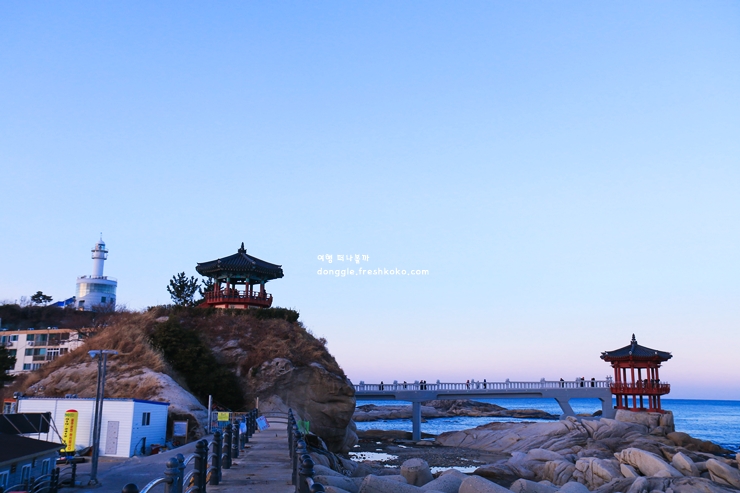 제가 방문했을 때는 아침 햇살이 바다에 반사되어 반짝이는 풍경이 정말 아름다웠습니다. 정자 근처에는 벤치가 있어서 앉아 쉬며 풍경을 감상하기에도 좋았습니다. 해변 아래쪽으로 내려가는 계단이 있어 바다와 조금 더 가까이 다가갈 수 있습니다.