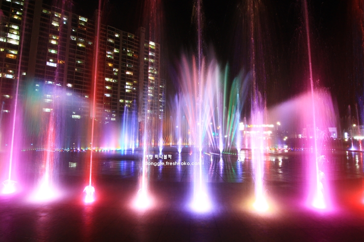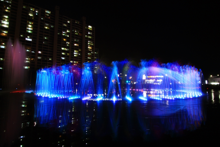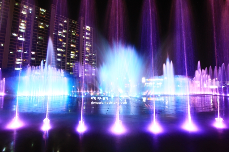 음악에 맞춰 높이 솟구치는 물줄기를 보고 있자니 바다와 조명이 하나가 되는 듯한 느낌이 들었습니다. 바닥에서 뿜어져 나오는 분수 덕분에 아이들은 신나게 뛰어다니며 물놀이를 즐기고 있었습니다.