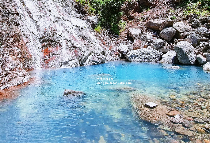 폭포 아래 작은 웅덩이에서는 시원한 물을 발에 담그는 이들도 있었습니다. 물소리 외에는 아무 소리도 들리지 않아 자연이 들려주는 고요함이 깊게 스며들었습니다.