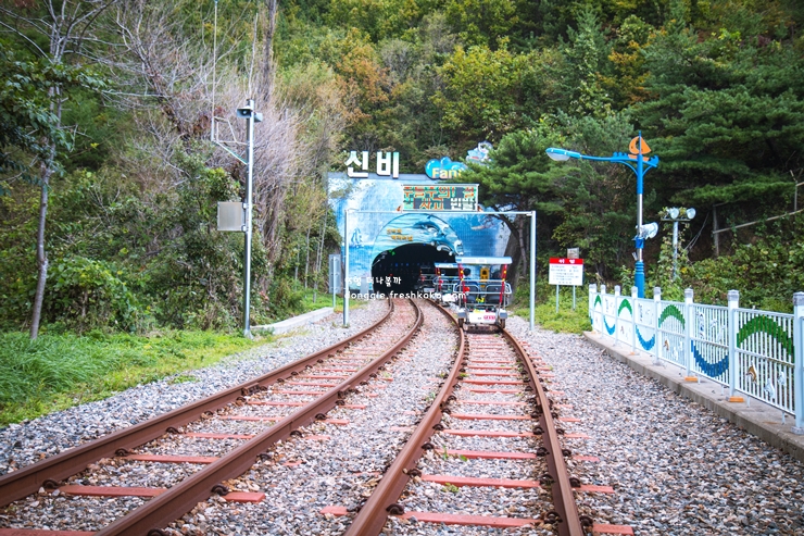 중간중간 터널을 지나갈 때는 조명과 음악이 어우러져 색다른 즐거움을 더해주었습니다. 레일바이크는 속도가 빠르지 않아 경치를 천천히 감상하기에 좋았습니다.