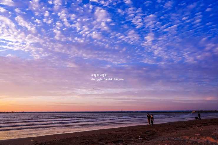 해변을 따라 걷다 보면 갯벌이 드러난 곳도 있어 조개껍데기를 줍는 재미가 있었습니다. 바다 냄새와 튀김 냄새가 섞여 발길을 유혹했고, 작은 매점 앞은 늘 사람들로 북적였습니다. 오후가 깊어지자 하늘은 노을로 물들고, 바다는 그 빛을 고요히 받아들이고 있었습니다.