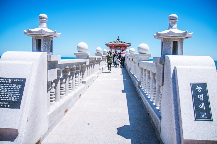 제가 방문했을 때는 아침 햇살이 바다에 반사되어 반짝이는 풍경이 정말 아름다웠습니다. 정자 근처에는 벤치가 있어서 앉아 쉬며 풍경을 감상하기에도 좋았습니다. 해변 아래쪽으로 내려가는 계단이 있어 바다와 조금 더 가까이 다가갈 수 있습니다.