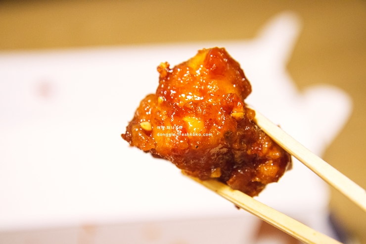 저는 명물이라 불리는 닭강정을 사서 먹었는데 매콤달콤한 양념이 입맛을 돋웠습니다. 시장 안쪽에는 싱싱한 생선과 회를 파는 가게들이 많아서 직접 고르고 식당으로 가져가 먹을 수도 있었습니다.