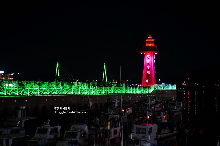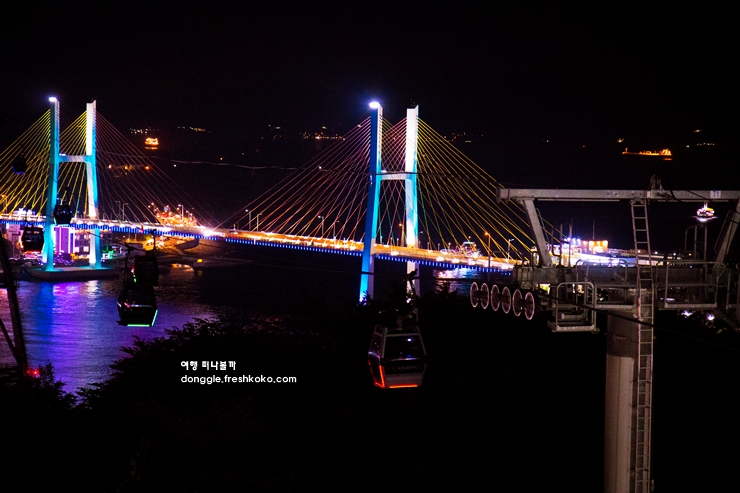 다리 위를 지나는 자동차들의 불빛이 길게 이어지고, 바다 위에는 고깃배들이 반짝이는 불을 켜고 떠 있는 모습이 한 폭의 그림처럼 다가왔습니다. 바닷바람이 선선하게 불어와 기분 좋게 머물 수 있었고, 높은 곳에서 바라보는 야경 덕분에 시야가 탁 트여 있었습니다.
