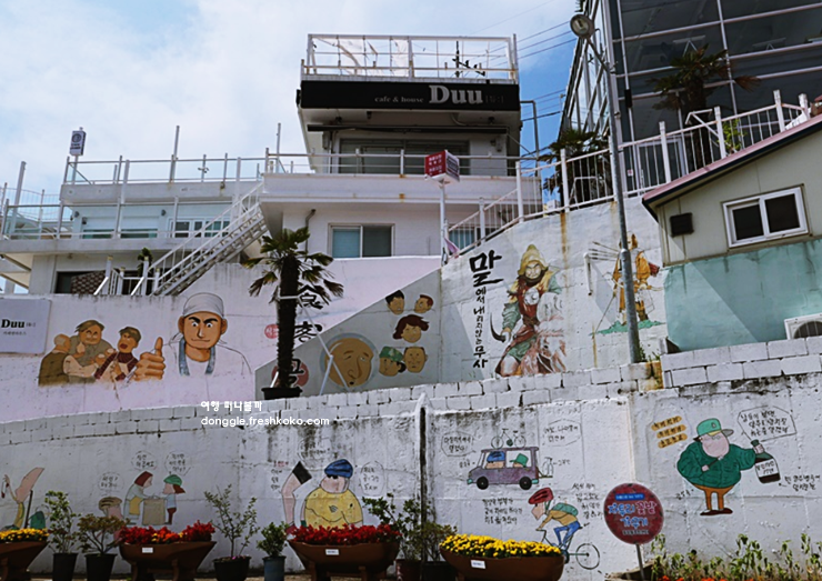 골목 끝자락에서는 벽화와 함께 바다까지 내려다보이며, 따뜻한 햇살이 벽에 드리운 그림자마저도 분위기를 더해주었습니다. 천천히 걸어 내려오는 길, 벽에 남겨진 색색의 그림들이 마을의 이야기를 들려주는 듯한 기분이 들었습니다.
