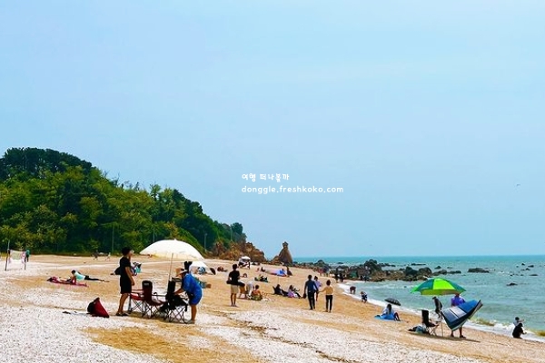 해변 끝자락에는 바위와 풀숲이 어우러져 있어 산책하며 사진 찍기에도 좋은 장소였어요. 아이들이 모래놀이에 집중하는 동안 어른들은 파도 소리 들으며 조용히 쉬고 있었어요.