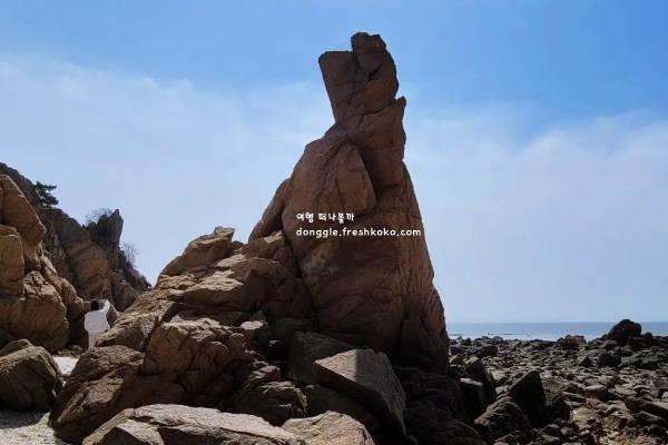 주차장에 차를 세우고 바닷가로 향하니 파도 소리보다 먼저 커다란 바위가 눈에 들어왔어요. 전설 속 선녀가 내려와 목욕했다는 그 바위는 생각보다도 웅장하고 고요한 분위기를 품고 있었어요.