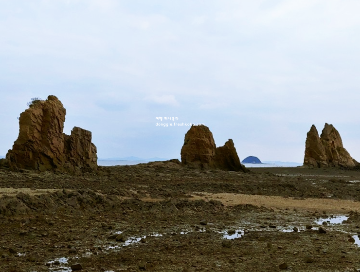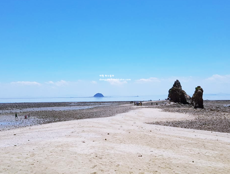 바닷길이 열리는 시간에 맞춰가면 누에섬까지 드러나는 길을 따라 걸어갈 수 있는데, 갯벌에 미끄러지지 않도록 운동화를 신는 게 좋았습니다. 길 양옆에는 갯벌 체험을 즐기는 사람들과 사진을 찍는 관광객들로 붐볐고, 물때를 놓치면 다시 바닷물이 차오르기 때문에 시간 체크는 필수였습니다.