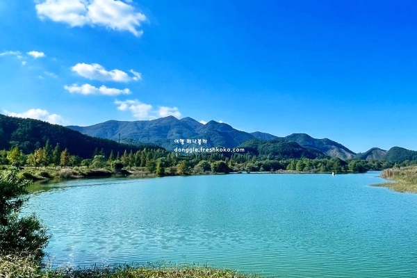 잔잔한 수면 위에 반사된 하늘과 산 그림자가 어우러져 오래도록 바라보게 만들었습니다. 전망대 근처에는 벤치와 정자도 있어서 커피 한 잔 들고 앉아 쉬기 좋았습니다. 호수 주변은 사람들이 많지 않아서 고요한 분위기를 즐길 수 있었습니다. 간혹 자전거 타는 사람이나 가벼운 산책을 하는 분들이 지나가기도 했습니다.