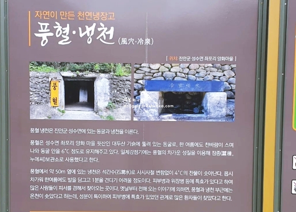 풍혈냉천은 진안 시내에서 차로 20분 정도 달려야 했는데, 조용한 마을 안쪽에 숨어 있듯 자리하고 있었던 진안 가볼만한곳 베스트10이었습니다. 입구에는 간단한 설명 안내판이 있었고, 나무계단을 따라 아래쪽으로 내려가면 냉천이 나타났습니다.