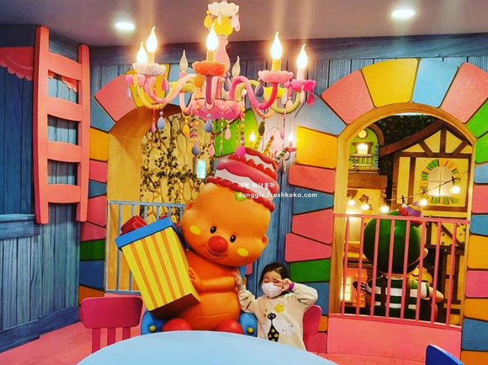 미끄럼틀이나 트램폴린 같은 대형 놀이기구뿐 아니라 소근육을 키우는 블록 놀이도 알차게 준비되어 있었어요. 곳곳에 캐릭터 요소가 숨어 있어 아이들이 직접 찾고 반응하는 모습이 참 즐거워 보였어요. 천장에서는 구름 모양 장식이 내려와 있어 상상 속 공간에 들어온 것 같은 착각이 들었고요.