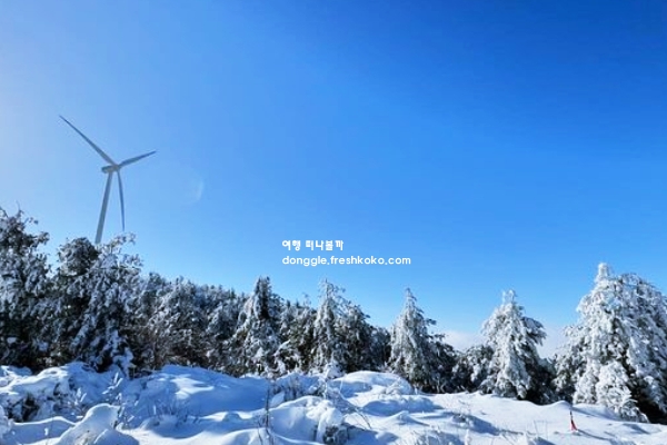 겨울철에는 눈이 내려 설경을 이루며, 맑은 날에는 푸른 하늘과 어우러져 더욱 선명한 경치를 감상할 수 있습니다. 태기산 정상에는 커다란 바람개비 같은 풍력발전기가 세워져 있어 색다른 풍경을 연출합니다.