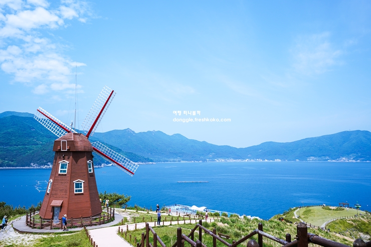 멀리 보이는 작은 섬들과 푸른 바다는 끝없이 이어지는 듯한 느낌을 주었습니다. 바람개비들이 줄지어 서 있는 길을 따라가니 바람이 불 때마다 부드럽게 돌아가며 언덕의 풍경을 더욱 특별하게 만들었습니다. 정상에 올라서면 바다가 한눈에 들어오고, 내려다보는 풍경이 속이 탁 트이는 듯한 느낌을 주었습니다.