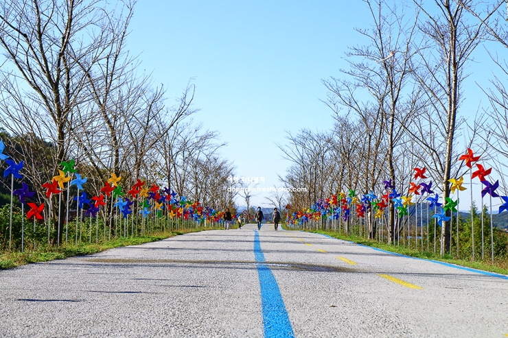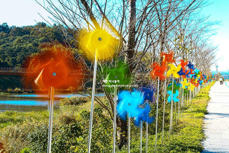 강을 따라 걷다 보니 조용한 물결이 반짝이고, 그 너머로 푸른 하늘이 시원하게 펼쳐졌습니다. 곳곳에 설치된 포토존 덕분에 사진을 남기기에도 좋았고, 마을 특유의 한적한 분위기가 몸과 마음을 편안하게 만들어 주었습니다. 바람이 적당히 불어오는 3월에는 바람개비가 가장 활발하게 돌아가는 시기라 더욱 인상적이었습니다.