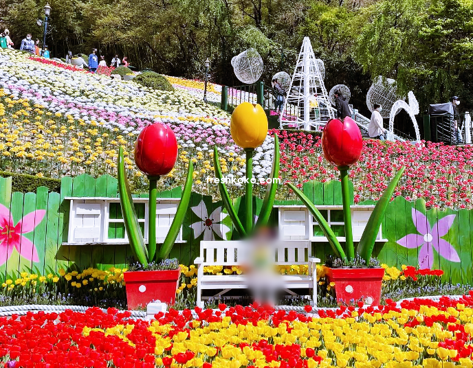공원 안으로 들어가자 튤립 정원이 한눈에 펼쳐졌는데, 붉은색과 노란색이 조화를 이루며 화사한 분위기를 더해주었습니다. 벚꽃이 만개한 산책로를 따라 걸으면서 곳곳에 마련된 포토존에서 사진을 남기는 분들도 많았습니다.