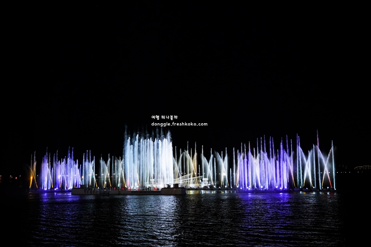 리듬을 따라 물기둥이 춤을 추듯 솟았다가 휘어지며 공중에서 반짝이는 물보라를 만들었습니다. 색색의 조명이 분수를 감싸기 시작하면 바닷물 위에 무지갯빛 파장이 퍼져나갑니다.
